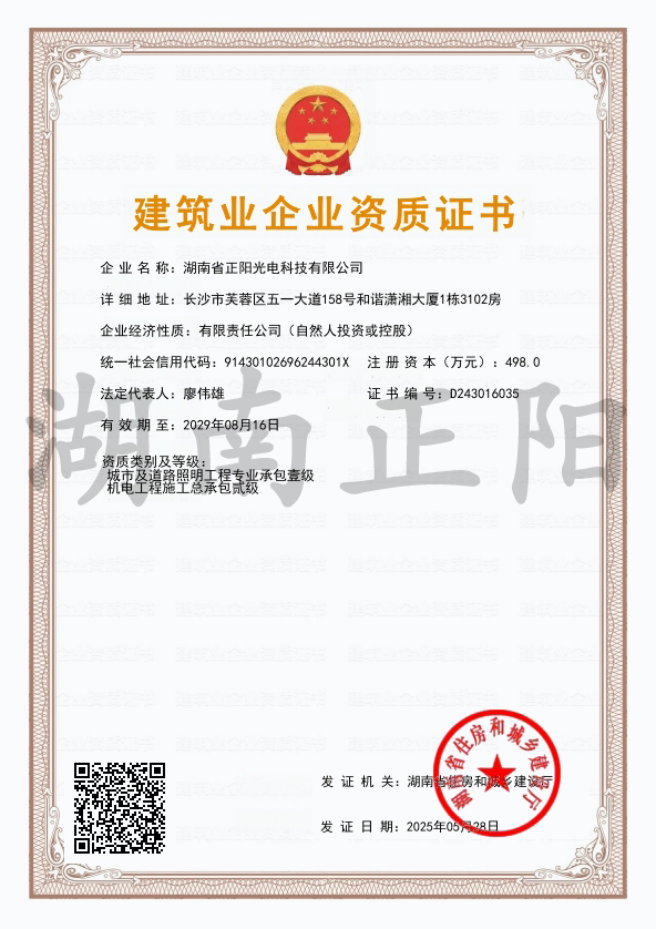 湖南省正陽(yáng)光電科技有限公司是一家從事亮化工程及大型燈光藝術(shù)的設(shè)計(jì)、制作、安裝和維護(hù)于一體的專(zhuān)業(yè)化公司。公司資質(zhì)齊全、管理嚴(yán)謹(jǐn)、技術(shù)先進(jìn)、實(shí)力雄厚,取得了城市及道路照明工程專(zhuān)業(yè)承包壹級(jí)資質(zhì)、照明工程設(shè)計(jì)專(zhuān)項(xiàng)甲級(jí)資質(zhì)、機(jī)電工程施工總承包貳級(jí)資質(zhì)、施工勞務(wù)等資質(zhì)、國(guó)家高新技術(shù)企業(yè)、國(guó)家“重質(zhì)量·守誠(chéng)信”示范企業(yè)。