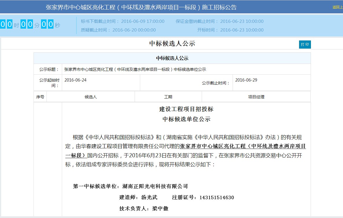 2016年6月24日,湖南省正陽光電科技有限公司成功中標(biāo)張家界市中心城區(qū)亮化工程(中環(huán)線及澧水兩岸項(xiàng)目一標(biāo)段)。